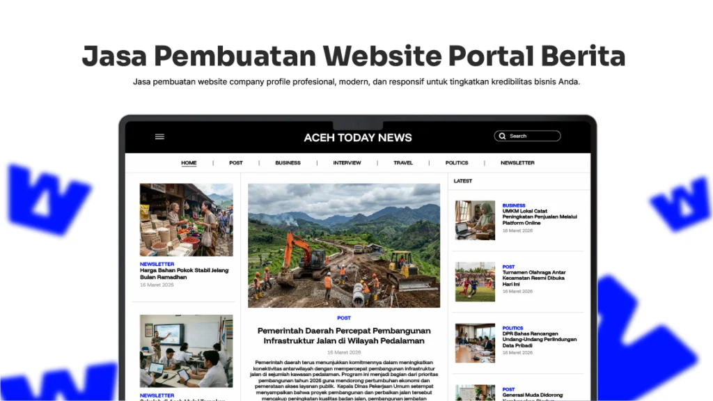 WebAceh membantu membangun website portal berita dengan desain profesional, sistem kategori yang rapi, serta fitur yang memudahkan pengelolaan artikel oleh tim redaksi.